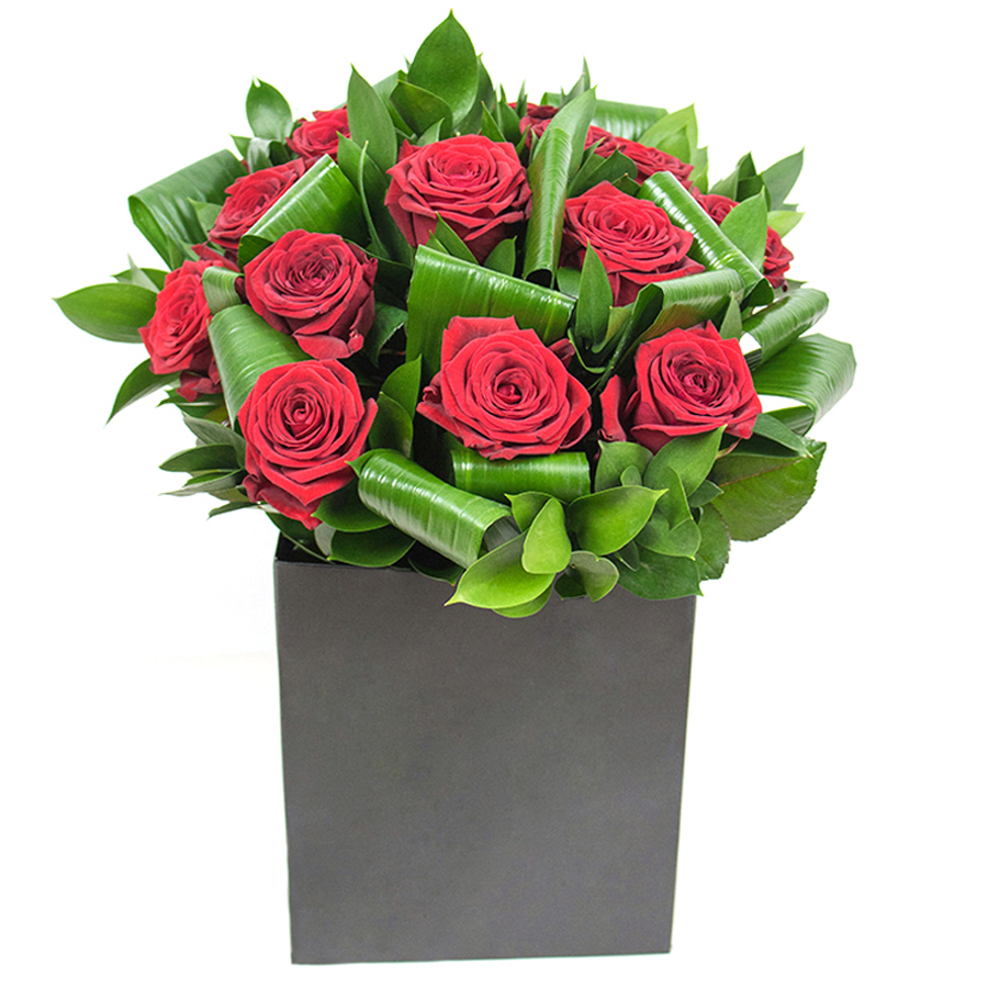 Our radiant bouquet is designed to enchant, pairing the rich, vibrant red of expertly chosen roses with the natural beauty of aspidistra leaves and ruscus. This arrangement exudes luxury, transforming any space with its tasteful blend of bold colors and delicate textures.